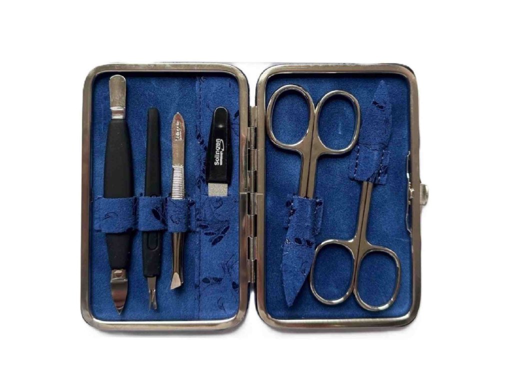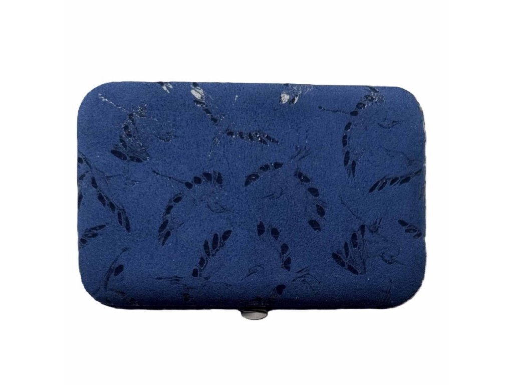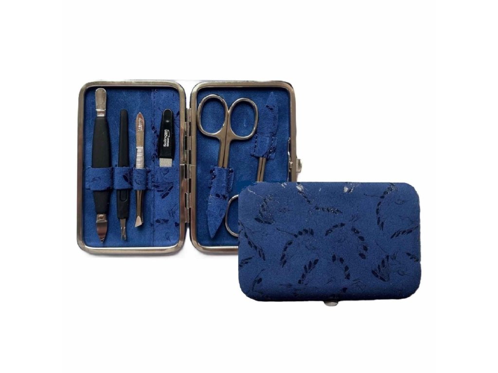 Elegantní rámová kožená 6 dílná manikúra značky Premium Line made in solingen se safírovým pilníkem v modré barvě s lesklým motivem modrých ptáčků.