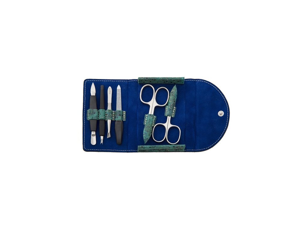 Manikúrová sada 6 dílná značky Premium Line made in solingen v smaragdově zelené barvě z kůže. Pouzdro na patent ve tvaru peněženky s kulatou chlopní.