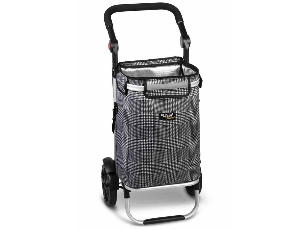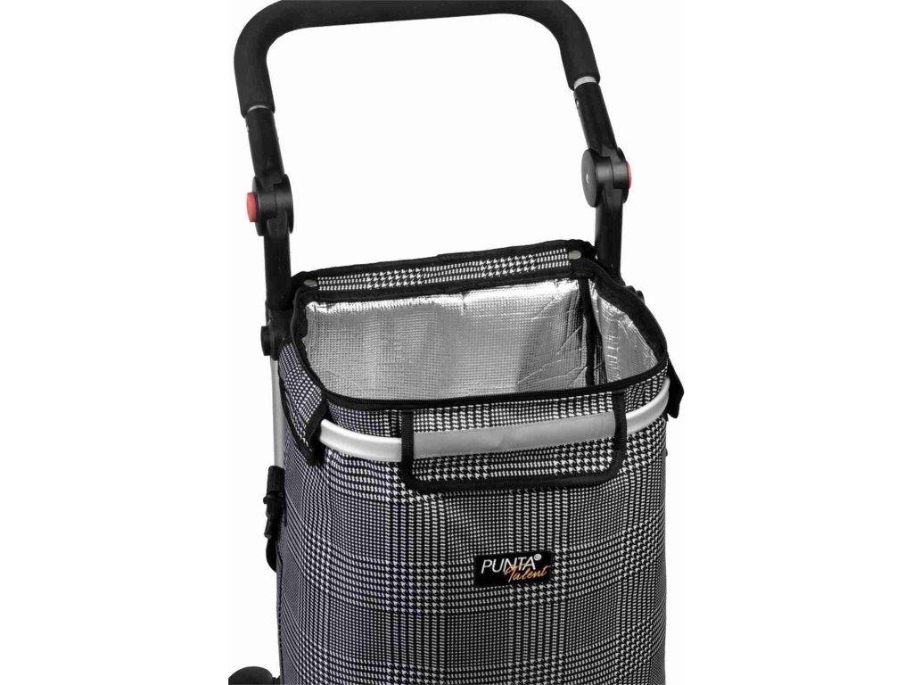 Špičková nákupní taška německé značky Fabrizio série Punta v kombinaci černé a bílé barvy se zajímavým potiskem zubatých čtverečků se zapínáním na zip a vnitřním termo prostorem a postranní kapsou. Dejte přednost velkým kolečkům a vaše nákupy se stanou srdeční záležitostí díky vysoké stabilitě a spolehlivosti tašky. Další předností tašky je lehký hliníkový rám a nastavitelná rukojeť.