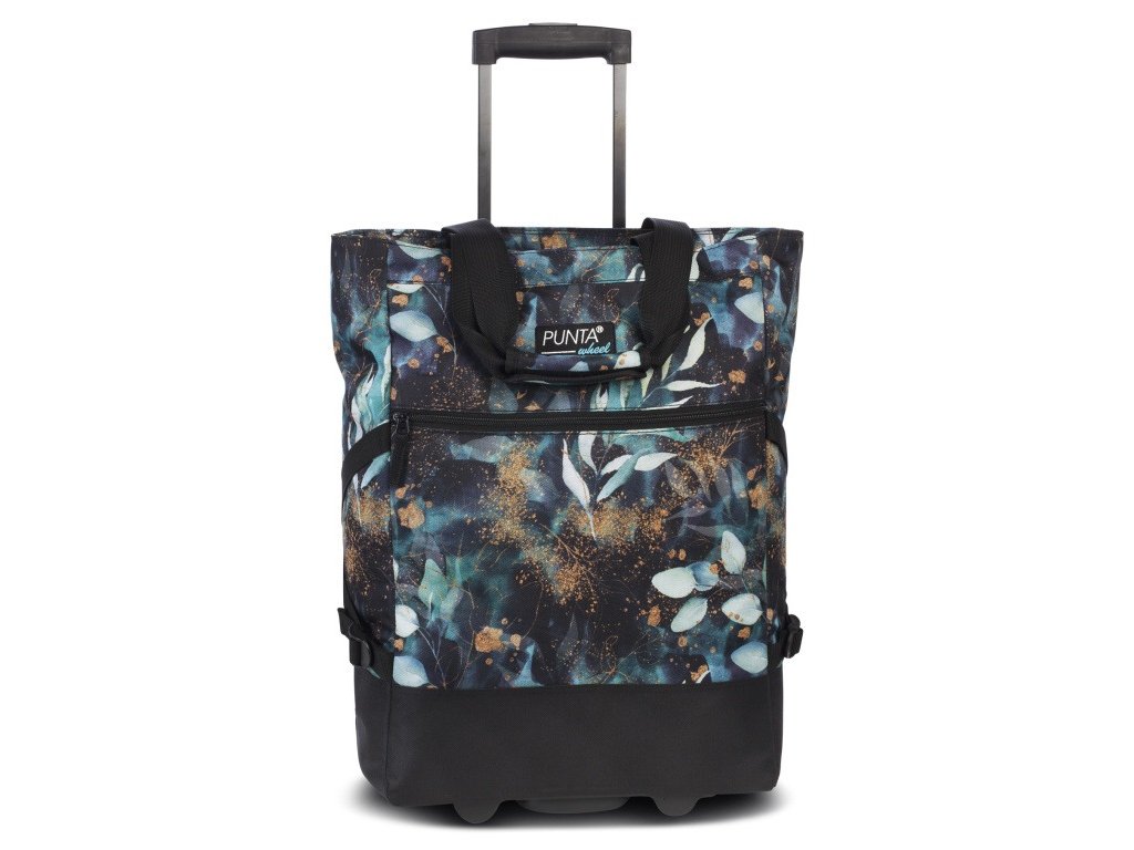 Praktická taška nejen na nákupy v moderním designu značky Punta v černé barvě s potiskem lístků v mentolové barvě. Tuto tašku můžete využít i na sport nebo na cestování, disponuje velkým objemem, dostatkem prostoru, je snadno omyvatelná a vyrobena ze zesíleného polyesteru. Inline kolečka umožňují jednoduchý pohyb po jakémkoli povrchu.