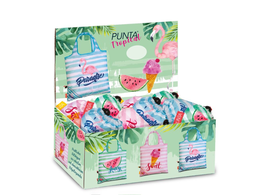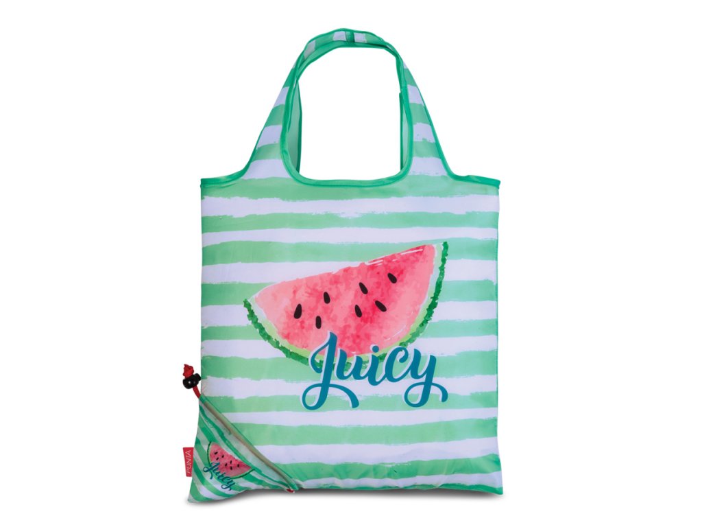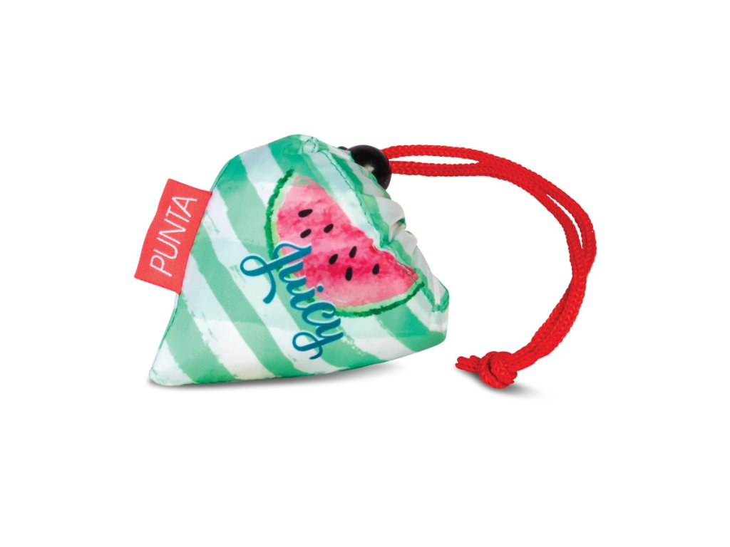 Skládací textilní nákupní taška německé značky Punta v zeleno-bílé barvě s letním potiskem melounu. Ideální pomocník na plánované i zcela nečekané nákupy. Lehká a všude skladná taška.