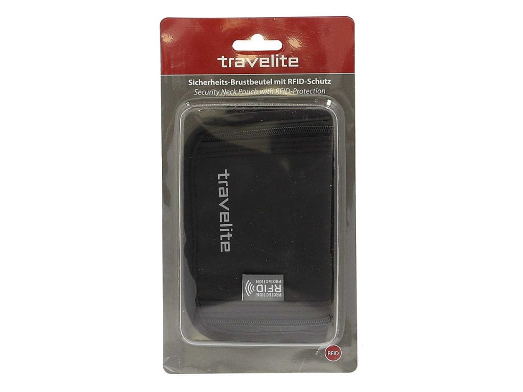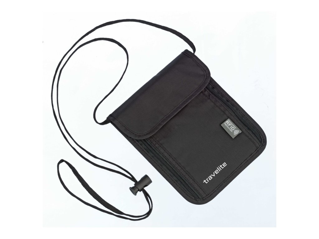 Bezpečnostní kapsa v černé barvě na zavěšení kolem krku. Tenké provedení - lze schovat pod oblečení. RFDI ochrana.