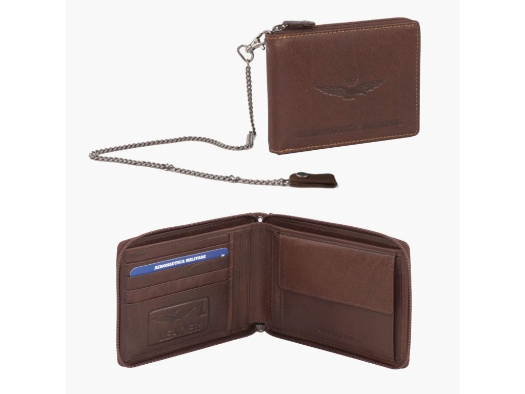 Pánská kožená peněženka italské prestižní značky Aeronautica Militare série New Eagle v hnědé barvě se zapínáním na zip a řetízkem. Vyrobeno z vysoce kvalitní kůže s vintage efektem – tyto peněženky z řady New Eagle od značky Aeronautica Militare jsou ideálním doplňkem pro ty, kteří hledají styl i praktičnost. Na přední straně vyniká reliéfní logo s křídly, které dodává peněžence výrazný a elegantní charakter. Kontrastní švy a ruční zpracování podtrhují důraz na detail.