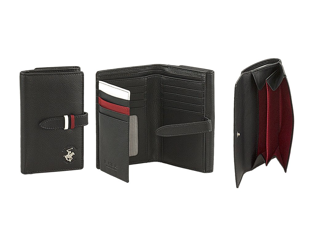 Dámská kožená peněženka značky Beverly Hills Polo Club série Loop v oblíbené černé barvě. Stylová dámská peněženka Beverly Hills Polo Club BH-1350 je přesně ten typ doplňku, který vypadá nenápadně luxusně a zároveň dává smysl v každodenním provozu. Kvalitní černá kůže, kontrastní červeno-bílé detaily a ikonické logo značky dávají jasně najevo, že tohle není žádná laciná náhražka. Uvnitř najdete přehledné členění s dostatkem prostoru pro platební i věrnostní karty, doklady a bankovky. Samostatná přihrádka na mince se zapínáním udrží drobné tam, kde mají být – žádné chrastění po kapsách. Praktické zapínání na druk zajišťuje, že peněženka drží tvar a obsah zůstane bezpečně uvnitř.