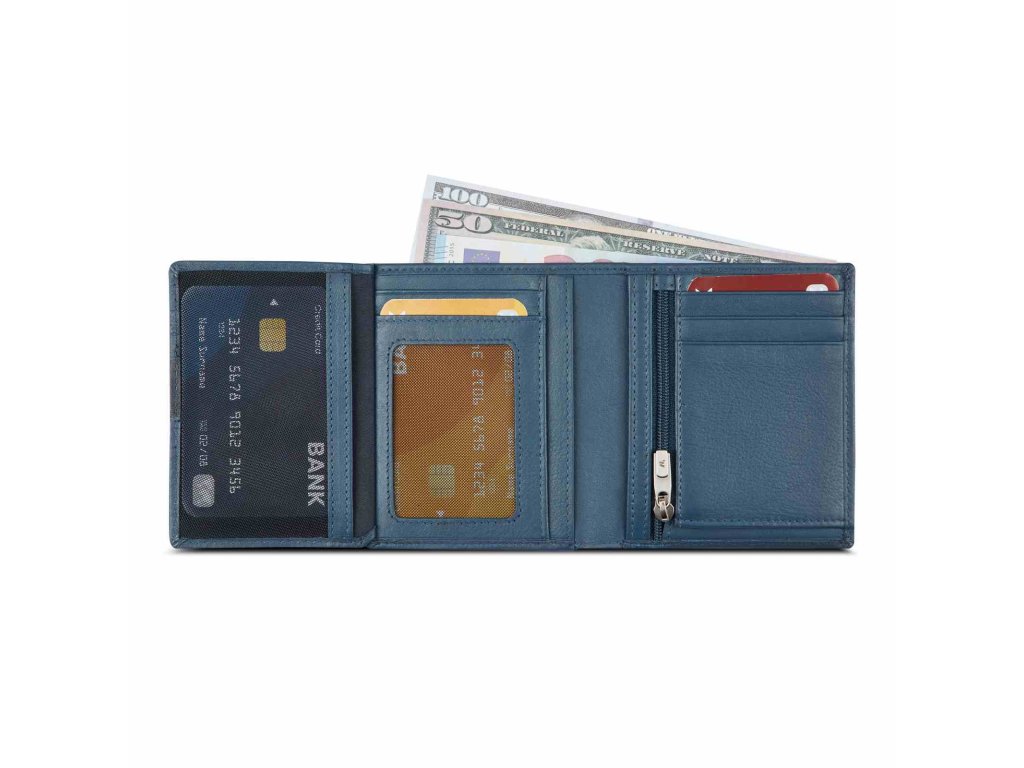 Pánská kožená peněženka od italské značky Roncato série Monaco pocket v modré barvě s výklopnou přepážkou do strany. Naše kolekce peněženek a doplňků je určena pro všechny, kteří hledají praktičnost, styl a univerzálnost v jednom produktu. Díky širokému výběru modelů – od kompaktních a minimalistických až po ty s extra kapsami a zipy – je každý kousek vytvořen tak, aby odpovídal různým každodenním potřebám.