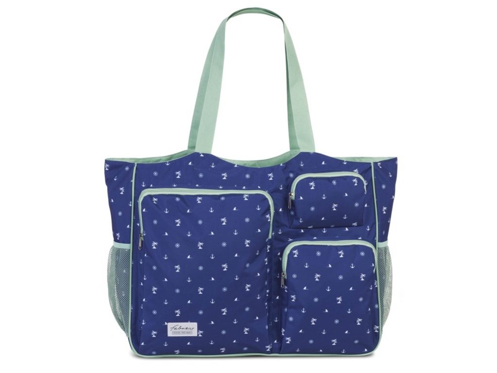 Plážová prostorná taška s kapsami pro ženy německé značky Fabrizio v kombinaci tmavě modré a zelené barvy s jemným potiskem. Vydejte se vstříc létu a pořiďte si k tomu tuto trendy plážovku s kapsami!