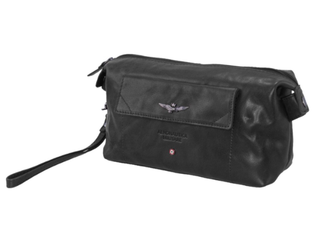 Praktická kožená taška do ruky na osobní věci nebo kosmetiku prestižní značky Aeronautica Militare v černé barvě. Tašku si oblíbíte díky komfortním rozměrům a uschováte do ní všechny své nejdůležitější věci, jako je peněženka, mobilní telefon, doklady i klíče. Pořiďte si tento luxusní, vkusný a moderní doplněk!
