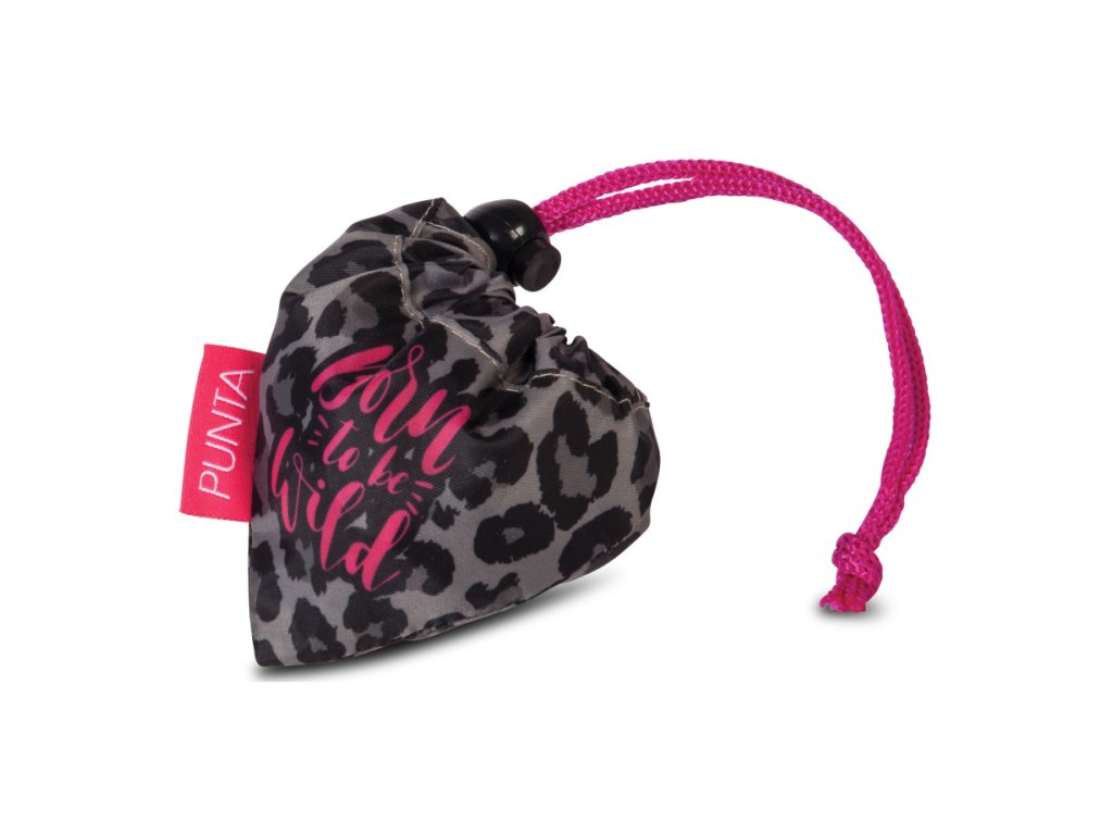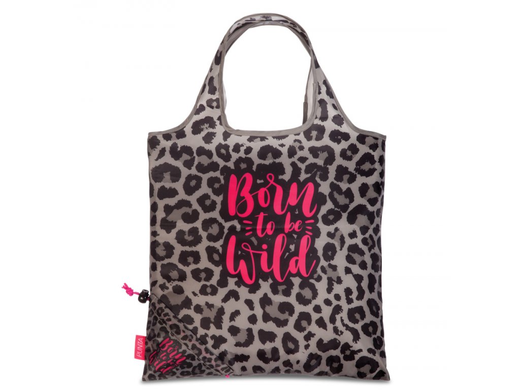 Dámská textilní nákupní taška značky Punta v šedo-černých gepardích barvách s nápisem. Ideální taška do kabelky. Skvělý pomocník na nákupy!