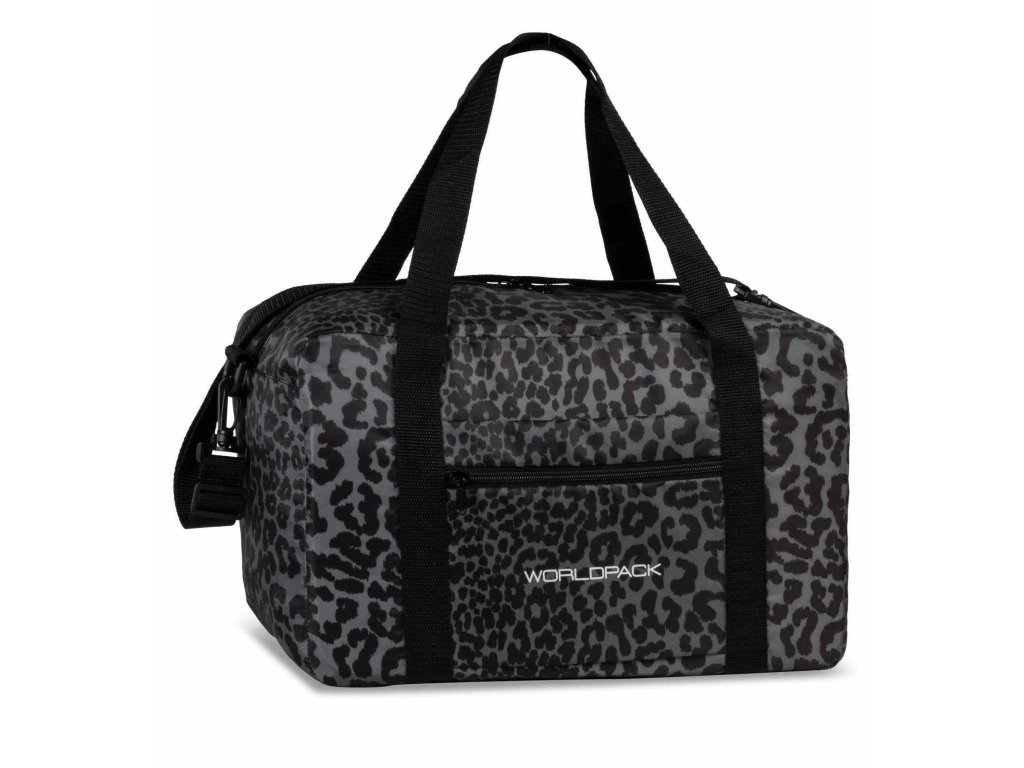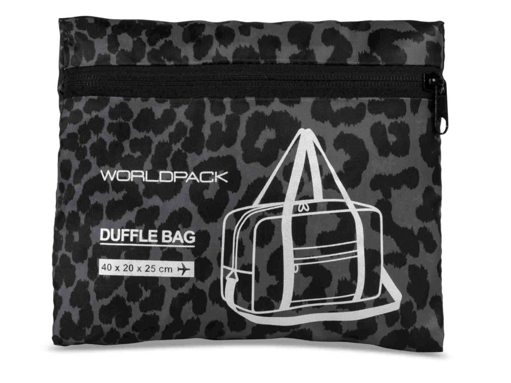 Skládací taška 40 cm do letadla německé značky Worldpack v šedohnědé barvě se zvířecím leopardím vzorem. Tato trendy taška je voděodolná, velice lehká a navíc se dá sbalit do kapsičky sebou jako náhradní zavazadlo. Tašku si můžete vzít s sebou do letadla, jak vyžaduje společnost Ryanair. Má rozměry, které akceptuje většina leteckých společností.