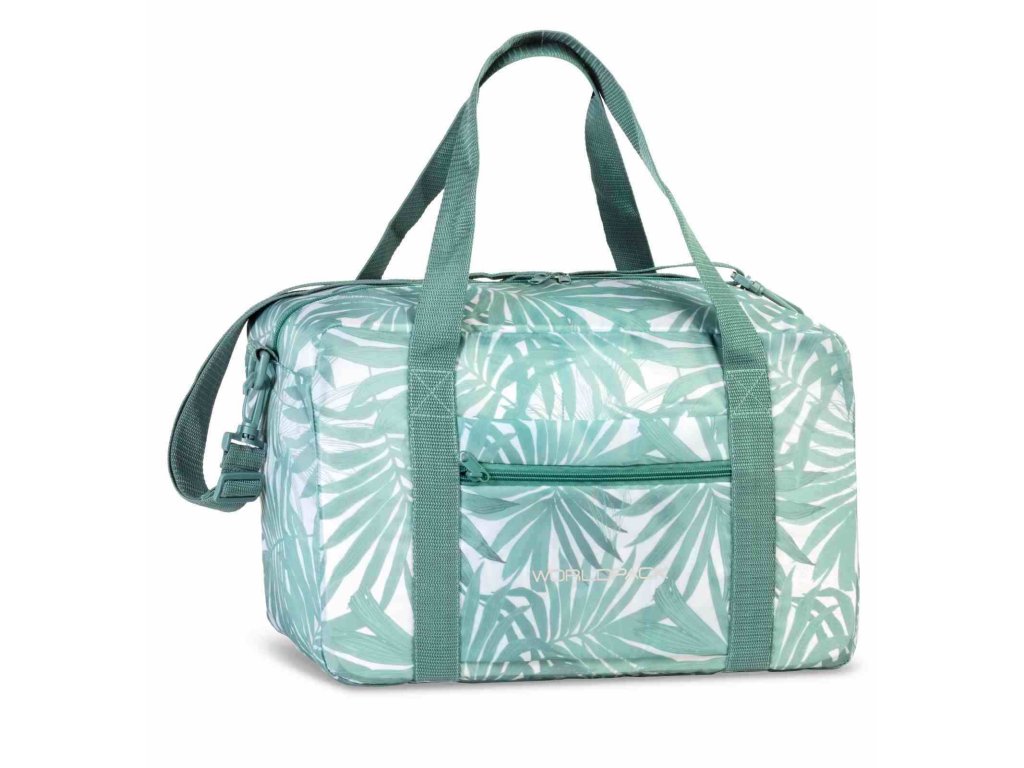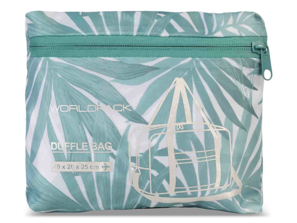 Skládací taška 40 cm do letadla německé značky Worldpack v bílé barvě s šedozelným potiskem listů palem. Tato trendy taška je voděodolná, velice lehká a navíc se dá sbalit do kapsičky sebou jako náhradní zavazadlo. Tašku si můžete vzít s sebou do letadla, jak vyžaduje společnost Ryanair. Má rozměry, které akceptuje většina leteckých společností.