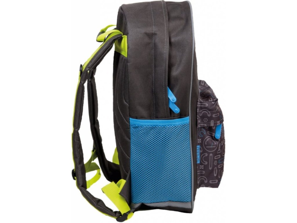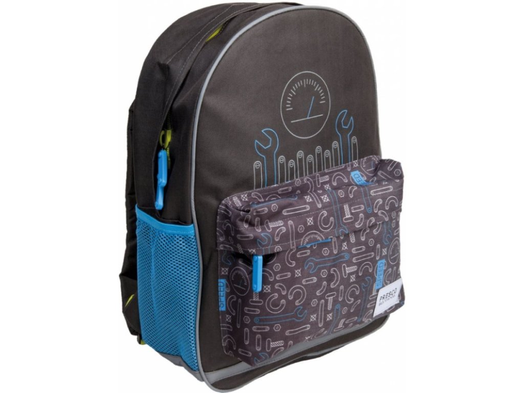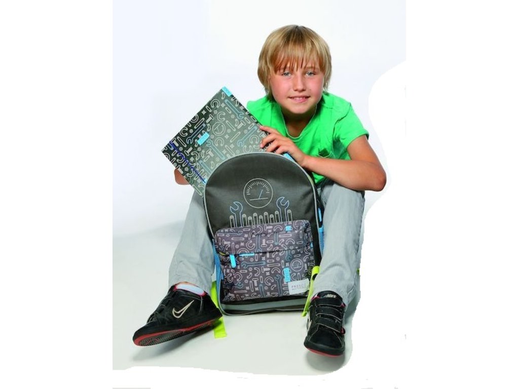 školní batoh Technic od značky Baagl v šedé-tyrkysové barvě menší velikosti s obrázky nářadí, vhodný pro kluky Zš nebo mimoškolní aktivity.