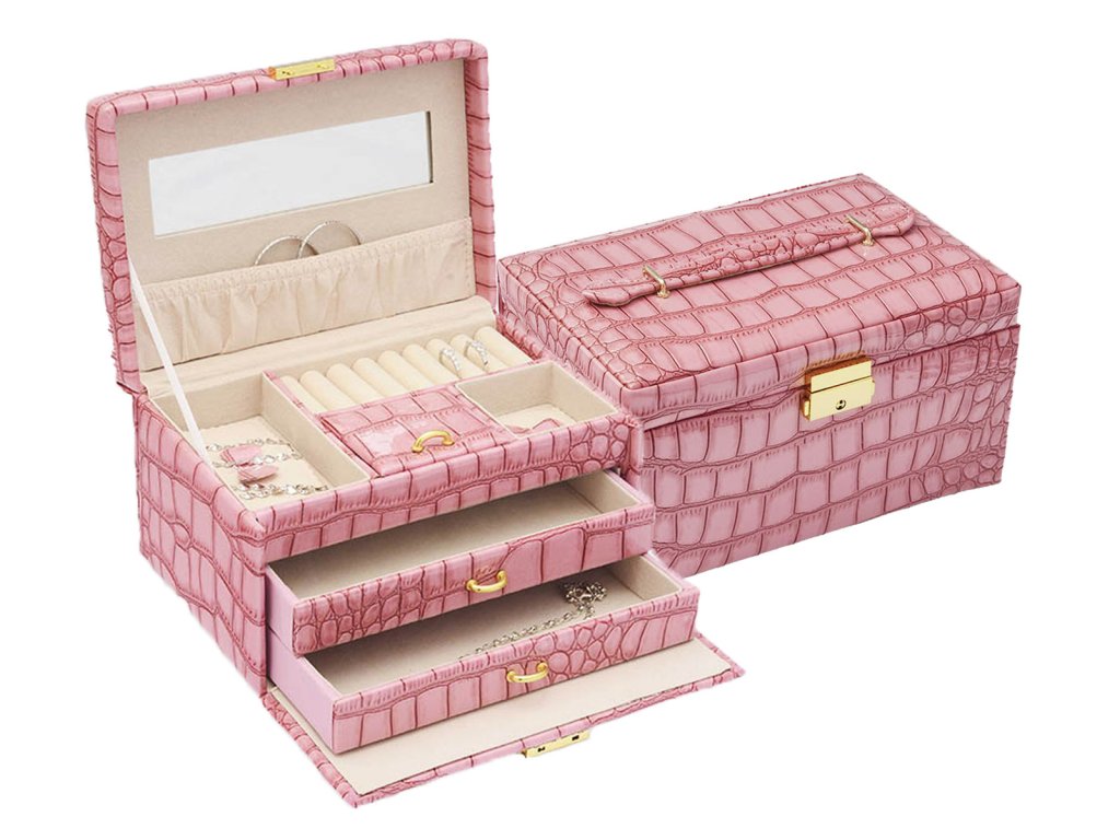 Elegantní a praktická šperkovnice české značky JKBOX v imitaci krokodýlí kůže v moderní růžové barvě. Dopřejte svým pokladům tuto prostornou šperkovnici, kterou můžete i darovat svým nejbližším a potěšit je tak originálním dárkem. Malá cestovní šperkovnice je součástí.