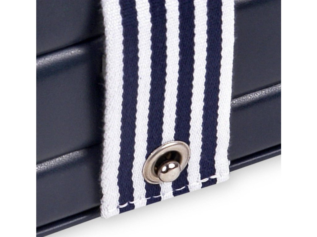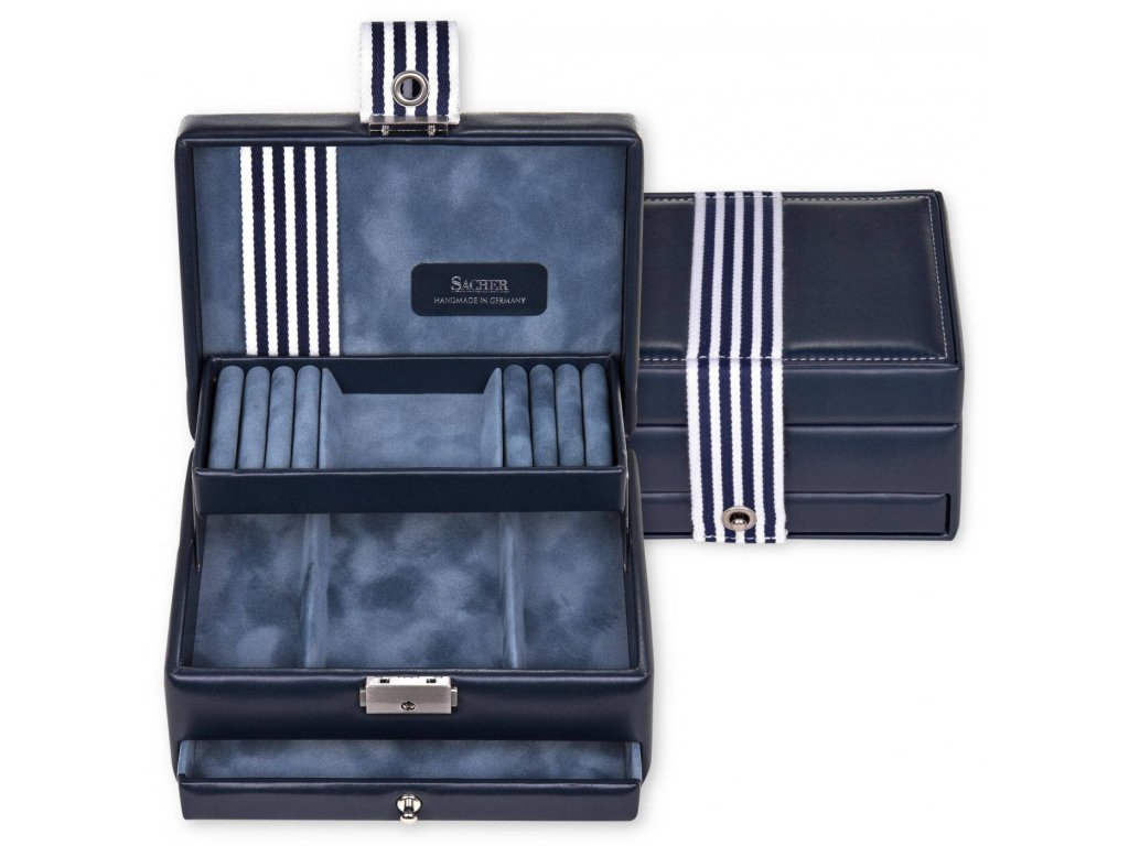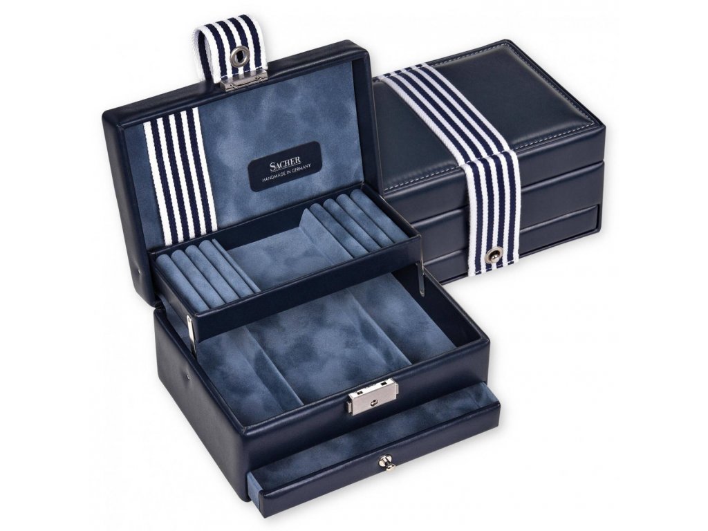Elegantní šperkovnice se šuplíčkem německé firmy Sacher v modré barvě s námořnickou pruhovanou aplikací. Buďte svá, buďte jedinečná se šperkovnicemi značky Sacher. Uložení vašich šperků bude bezpečné, praktické a přehledné. Ruční výroba šperkovnic Sacher zaručuje opravdu preciznost a kvalitu ve zpracování.