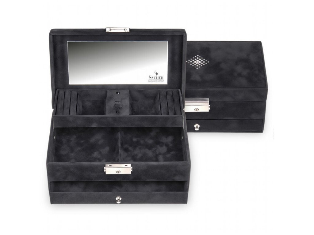Elegantní šperkovnice pro moderní dámy německé značky Sacher v oblíbené černé barvě s prvky kamínků od Swarowski. Tato luxusní šperkovnice bezpečně, prakticky a stylově uschová vaše šperky. Je vybavena uzamykatelným zámkem. Ruční výroba šperkovnic Sacher zaručuje opravdu preciznost a kvalitu ve zpracování.