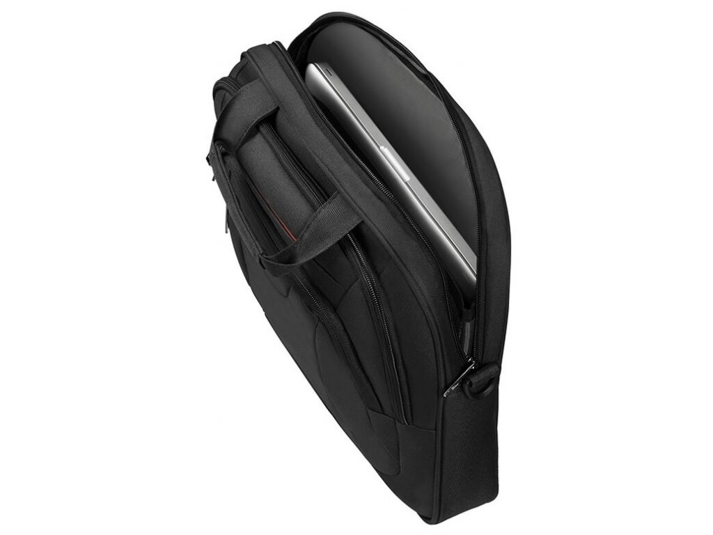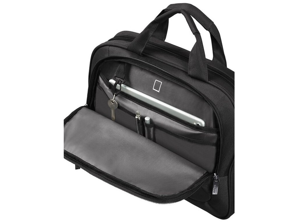 Taška na notebook American Tourister At work 15,6 má z přední strany samostatnou kapsu na zip s organizérem. V hlavní části je polstrovaná přihrádka na notebook. Brašna má nastavitelný odnímatelný popruh na rameno a navlékací pásek sloužící ke snadnému připevnění na rukojeť kufru.