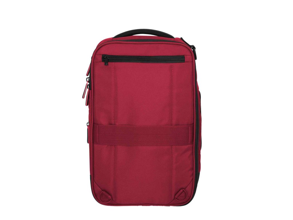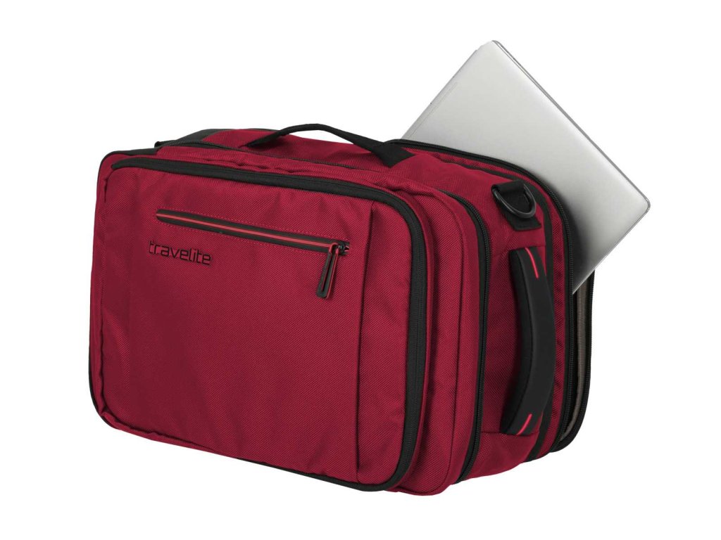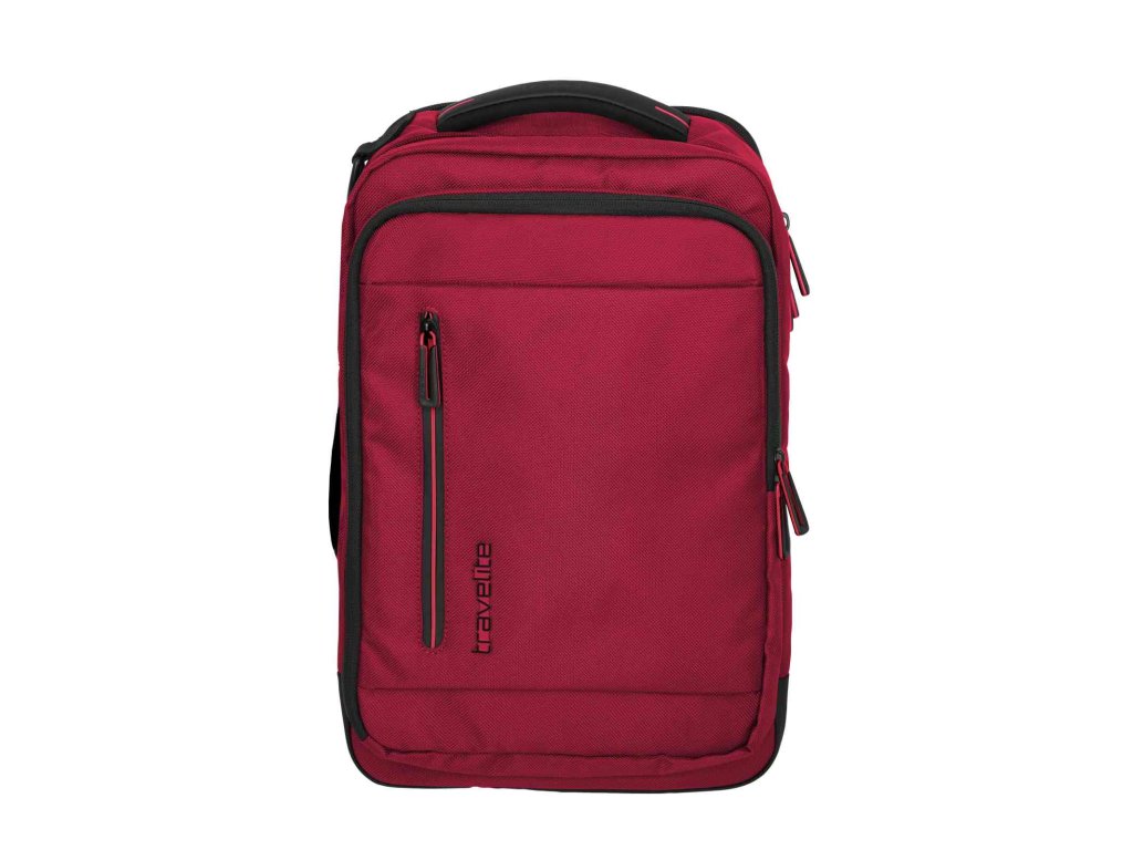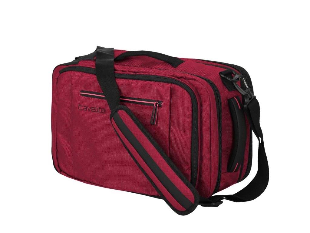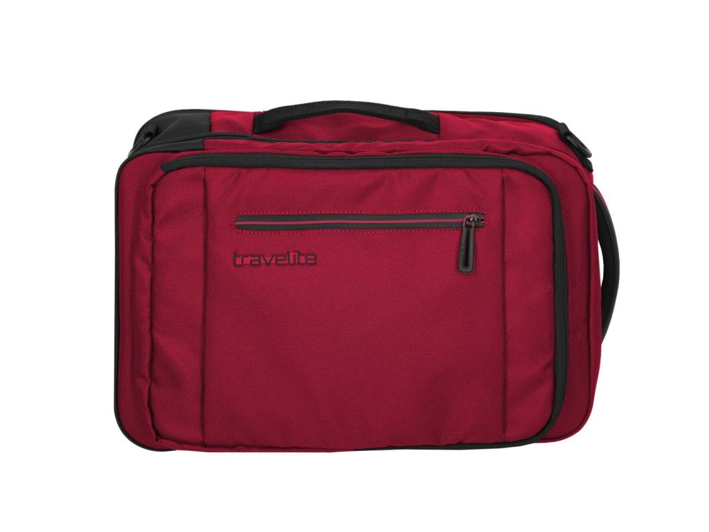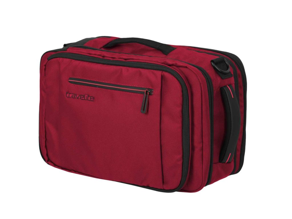 Textilní batoh-taška do letadla německé značky Travelite série Crosslite 5.0 v tmavě červené barvě. Toto palubní zavazadlo si můžete vzít s sebou do letadla, jak vyžaduje společnost Ryanair. Má rozměry, které akceptuje většina leteckých společností. Kaž