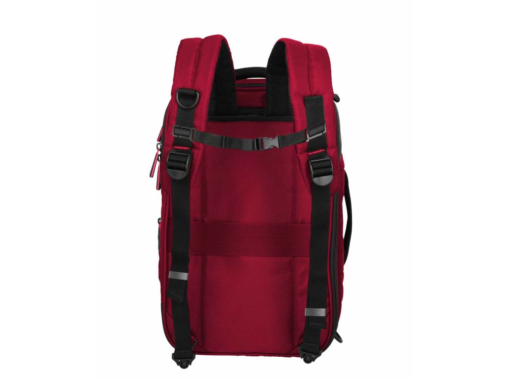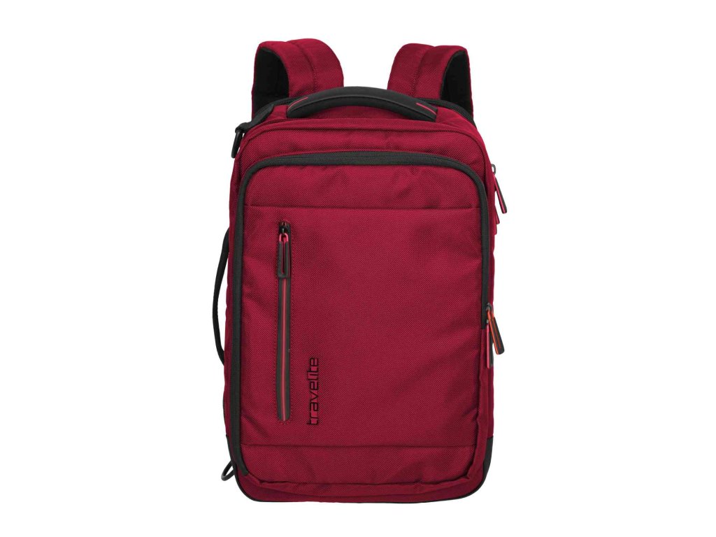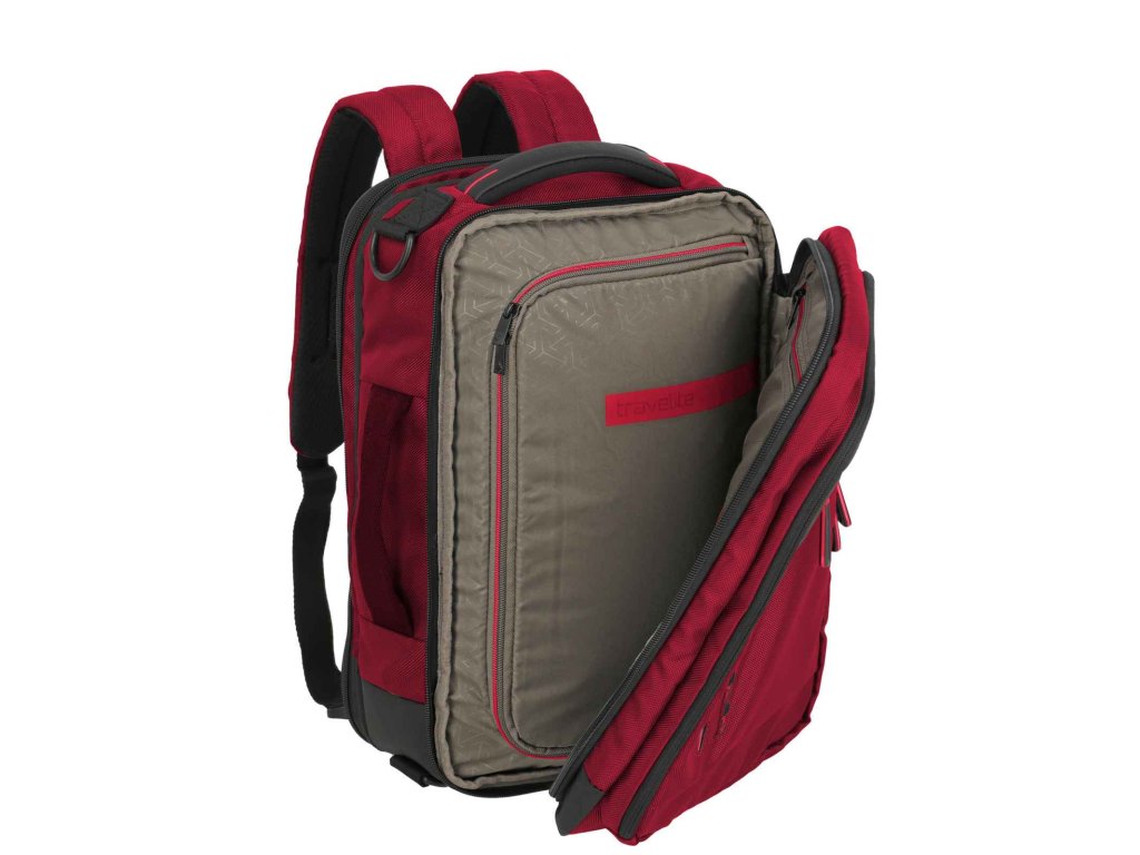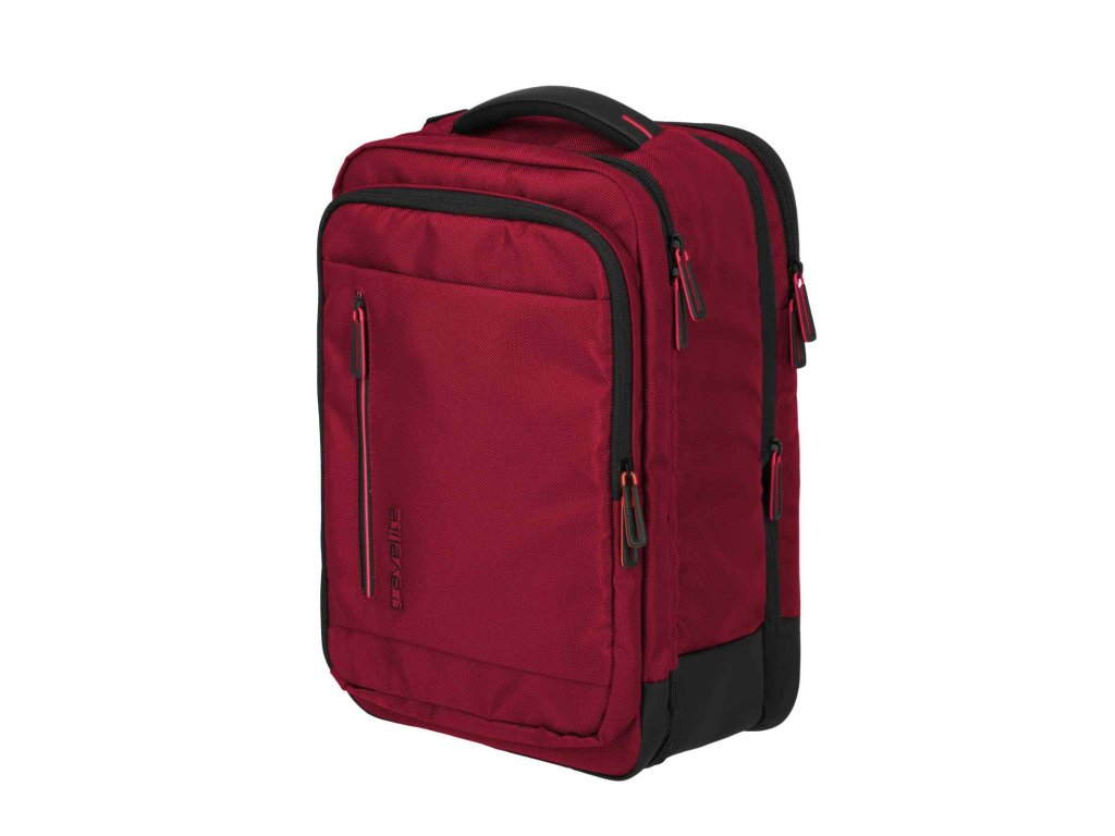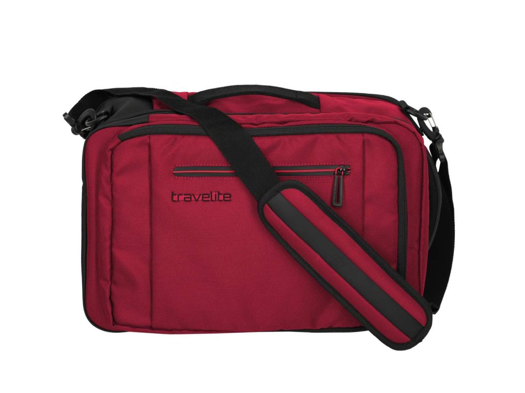 Textilní batoh-taška do letadla německé značky Travelite série Crosslite 5.0 v tmavě červené barvě. Toto palubní zavazadlo si můžete vzít s sebou do letadla, jak vyžaduje společnost Ryanair. Má rozměry, které akceptuje většina leteckých společností. Kaž