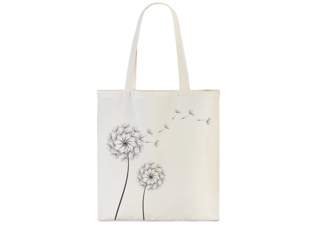 Multifunkční textilní taška značky Fabrizio v bílé barvě s potiskem černých pampelišek, z nichž odlétávají drobná semínka unášená větrem. Skvěle se hodí na nákupy, výlety, do práce i do školy. Taška je vyrobená z pevného, příjemného materiálu, takže bez problému unese všechny vaše nezbytnosti – a navíc vypadá skvěle.