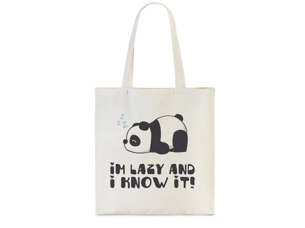 Multifunkční textilní taška značky Fabrizio v bílé barvě s potiskem pandy a nápisem im lazy and i know it. Skvěle se hodí na nákupy, výlety, do práce i do školy. Taška je vyrobená z pevného, příjemného materiálu, takže bez problému unese všechny vaše nezbytnosti – a navíc vypadá skvěle.