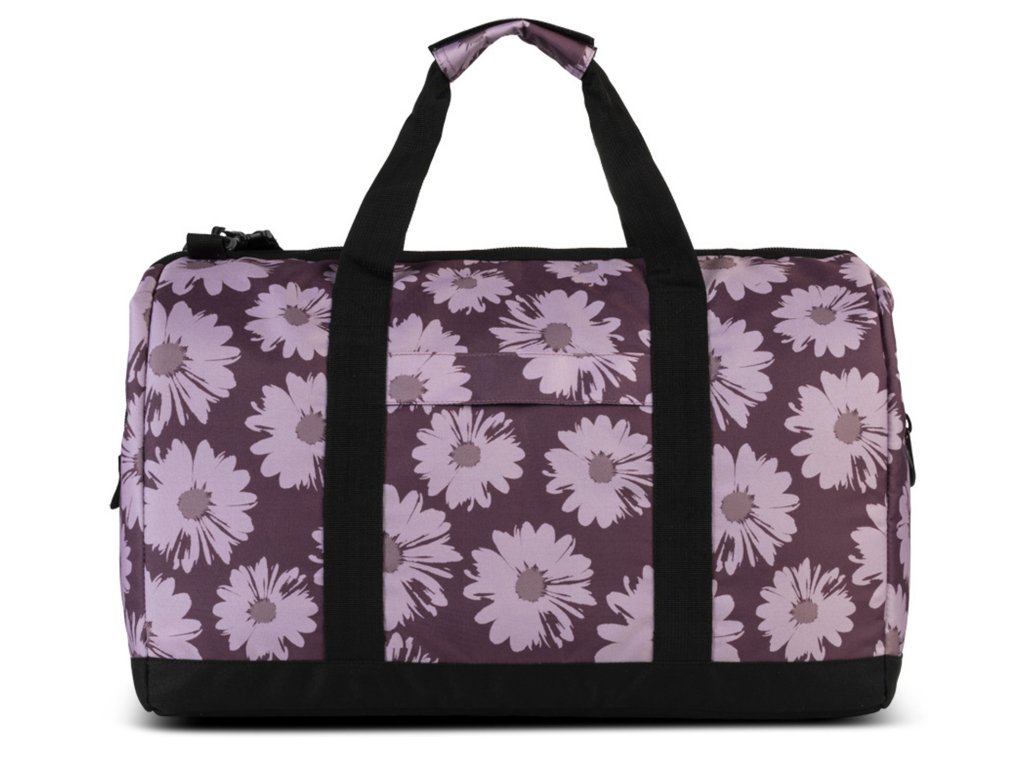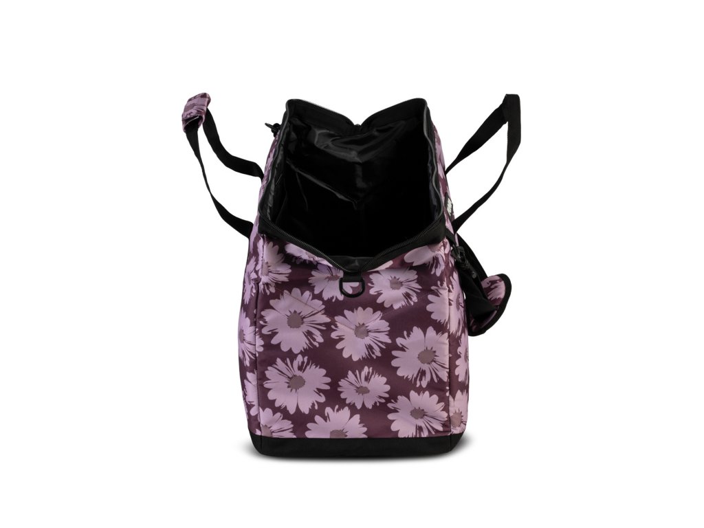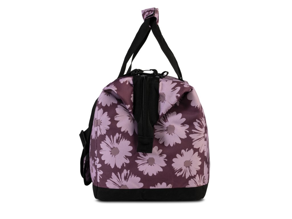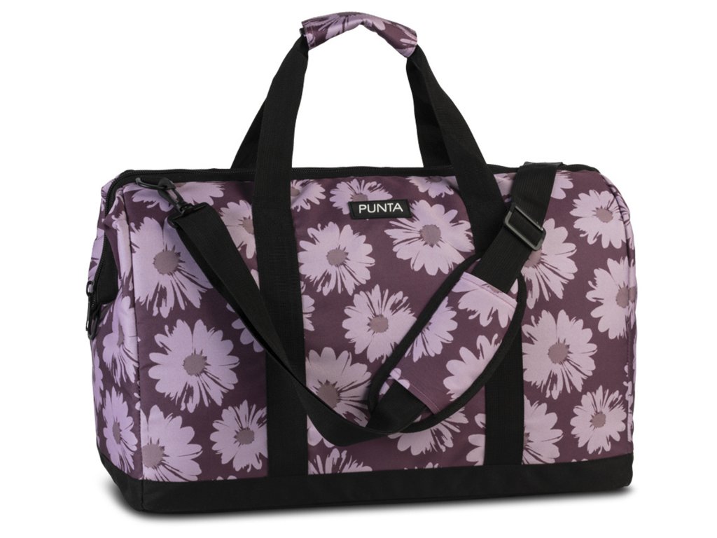 Textilní víkendová taška přes rameno značky Fabrizio Punta v kombinaci tmavě a světle fialové barvy s výrazným květinovým vzorem. Světle fialové květy kontrastují s tmavě fialovým podkladem a vytvářejí moderní, ženský a hravý motiv. Vzor je rozložen po celé ploše tašky, takže působí výrazně, ale zároveň elegantně. Tato moderní a spolehlivá taška Vám poskytne patřičný komfort při cestování i při sportovních aktivitách a to kvůli kovové výztuži, která zajistí, že věci v tašce jsou lehce přístupné.